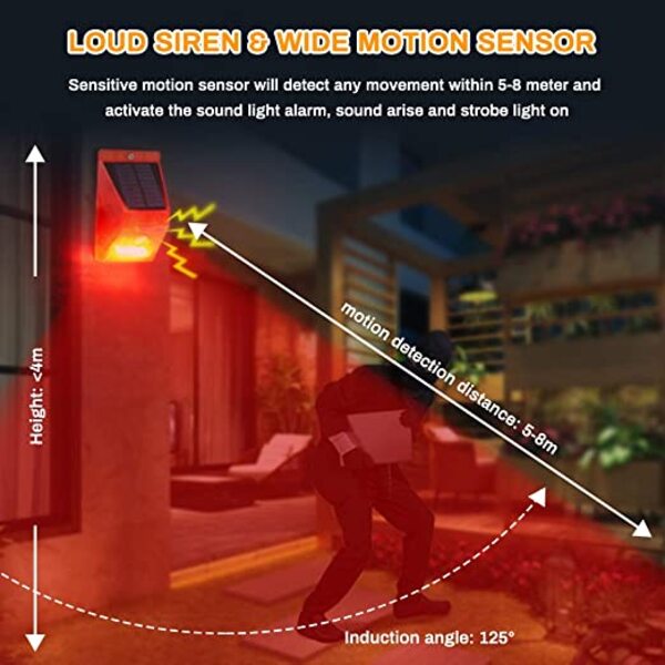 Osetljivi senzor pokreta će detektovati bilo koji pokret u krugu od 5-8 metara i aktivirati zvučni i svjetlosni alarm. Sa uglom senzora od 125°, zvuk sirene od 129 db i 8 svjetlih LED dioda, može se čuti i videti sa udaljenosti od 1000 m čime odlično štiti i osigurava od ulaska lopova.
