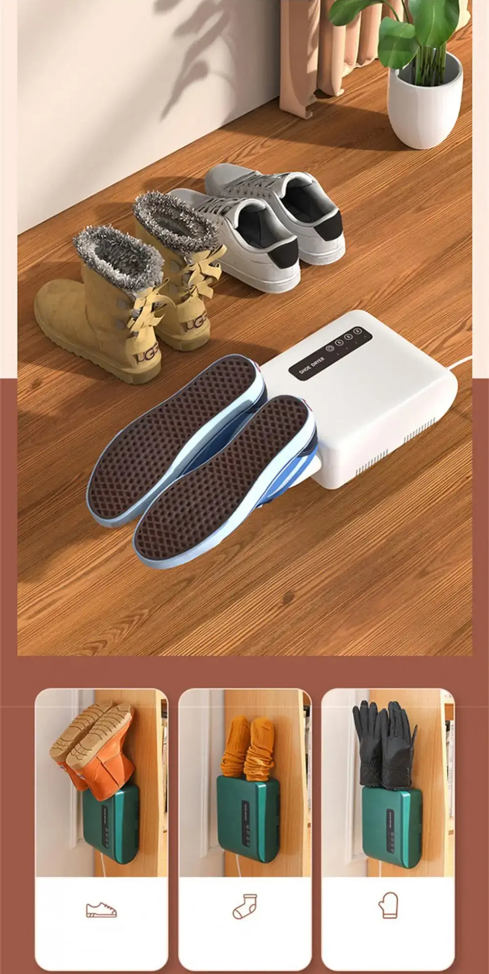 Uključuje funkcije sušenja cipela i sušenja odjeće u jednoj mašini. Pogodan je za sve vrste cipela, čizama, rukavica i čarapa.